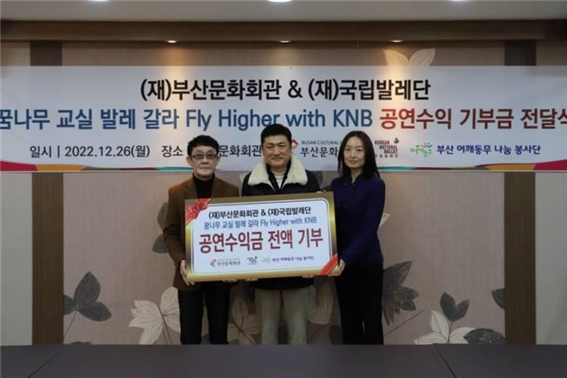 [로컬세계 부산=맹화찬 기자] (재)부산문화회관은 26일 부산문화회관 접견실에서 ‘발레 갈라 공연-Fly Higher with KNB(국립발레단)’의 공연수입금 전액을 부산어깨동무나눔봉사단에 기부하는 기부금 전달식을 진행했다.