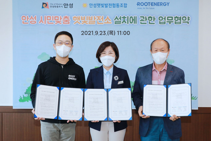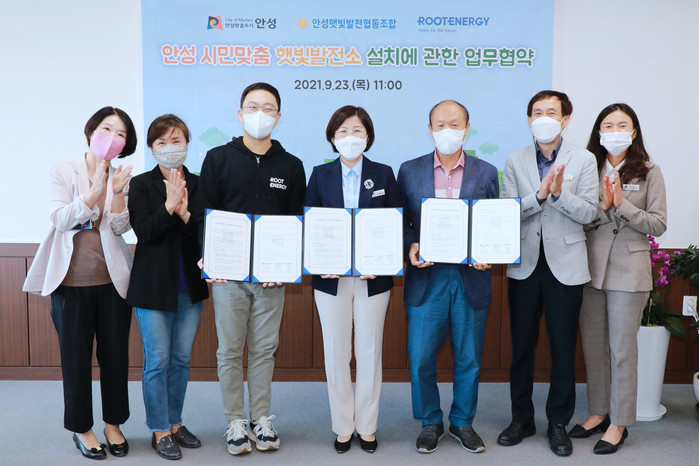 | ▲안성시와 안성햇빛발전협동조합, 루트에너지는 23일 업무협약을 맺고 안성시청 본관 옥상에 100kwh 규모의 태양광 발전시설을 설치하기로 했다.(안성시 제공) |