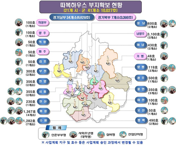 도는 지난해 5월부터 도내 31개 시‧군을 대상으로 후보지를 물색한 결과 수원, 남양주 등 21개 시‧군 41개 부지에 따복하우스 1만27호를 건설하기로 결정했다.