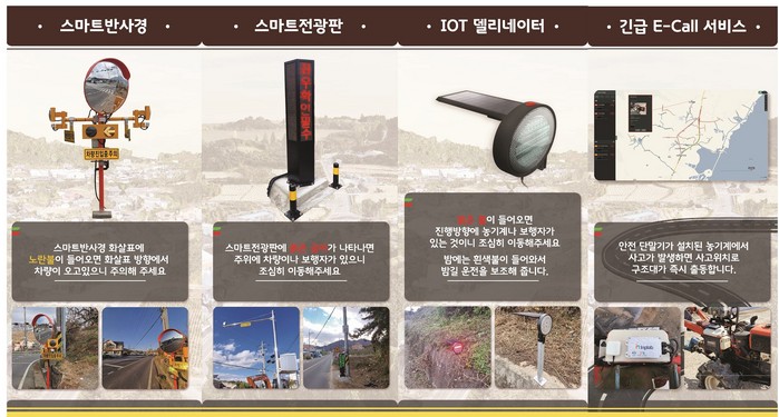 주요 사업내용으로는 △‘안심 모빌리티 종합알림 서비스’로 4종의 교통 안전 서비스장치(스마트CCTV, 스마트 전광판, 스마트 반사경, 델리웨이브)를 대상지 마을을 통과하는 지방도30호선의 사고 다발구역, 사고 유발지점에 설치하여 보행자, 운전자에게 알림을 주어 방어보행, 방어운전을 유도함으로써 사고를 사전에 예방할 수 있도록 도움을 주는 서비스이다.