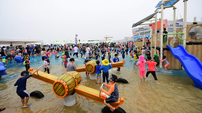 화성 뱃놀이 축제 물놀이 체험장에서 관광객들이 이른 더위를 날리고 있다.