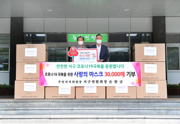 손완규 서구주민자치연합회장은 “경제적 부담으로 마스크 구입에 어려움을 겪고 있는 취약계층 주민들에게 조금이라도 도움이 되기를 바라는 마음에서 기부하게 됐다”고 기부의 뜻을 전했다.