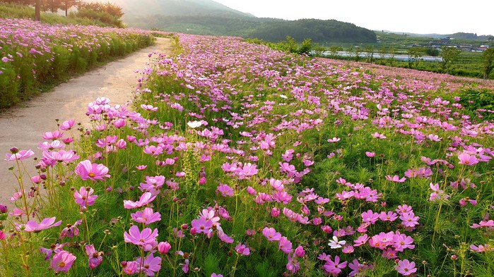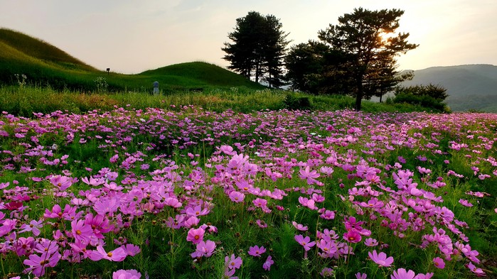 코스모스 꽃밭 인근에는 푸른 초원, 노송, 고분군으로 둘러 쌓여있어 멋진 광경을 연출하고 있다.