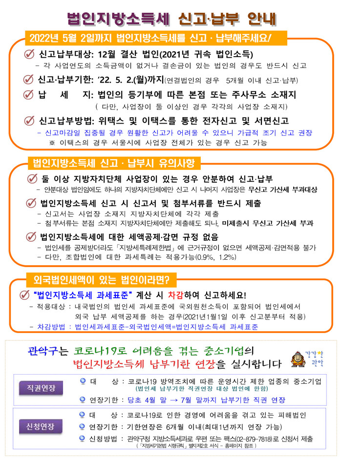 또한 제한 업종이 아니더라도 코로나19로 사업에 현저한 손실이 발생한 법인은 4월 29일까지 관악구청 지방소득세과에 신청서를 제출하면, 검토 후 6개월(최대1년) 범위 내에서 기한을 연장 받을 수 있다.