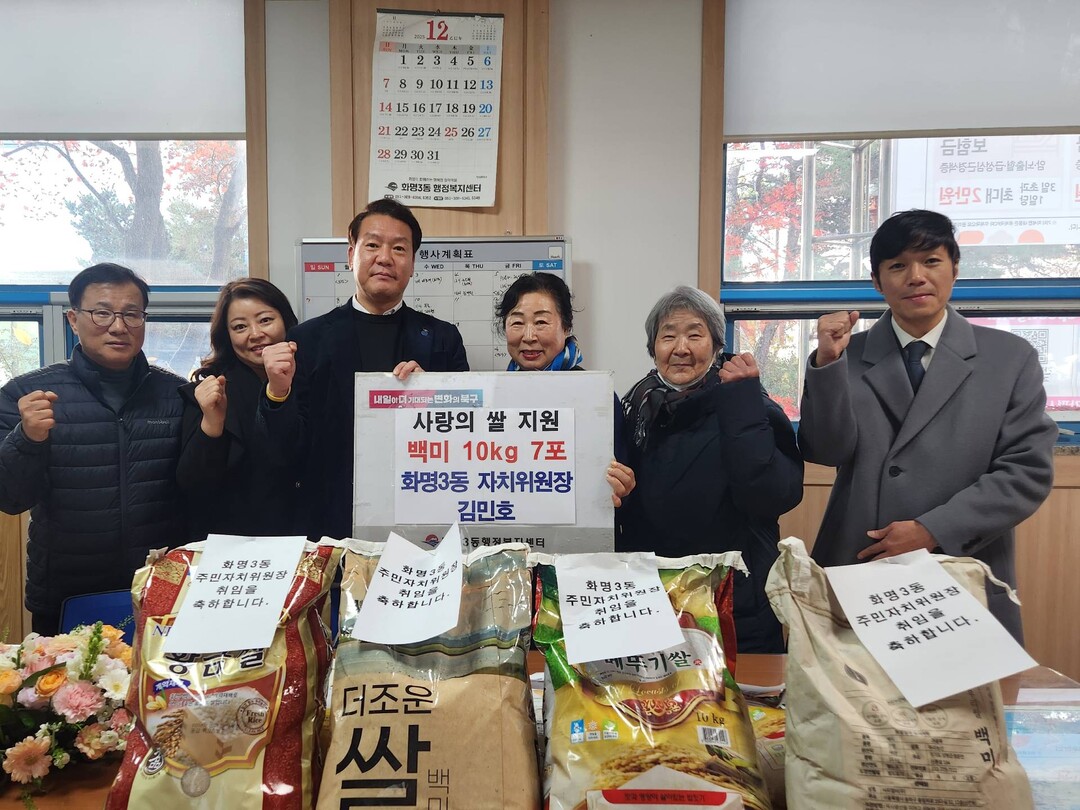 [로컬세계 = 맹화찬 기자] 부산 북구 화명3동 김민호(위 사진) 신임 주민자치위원장은 지난 2일 열린 주민자치위원장 이·취임식에 축하 화환 대신 받은 성품 백미 10kg 7포를 관내 진여원(진여봉사회)에 기탁했다고 8일 밝혔다.