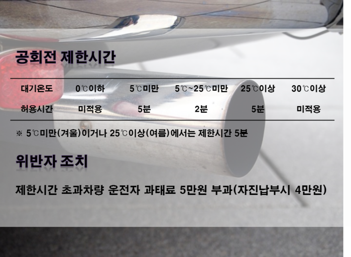 다음달부터는 자동차정비업소에 대한 공회전 단속도 시작한다. 집진장치 등 정화장치 없이 약품 등을 사용해 정비하며 과도한 공회전을 할 경우 적발시 과태료 5만원이 부과된다.