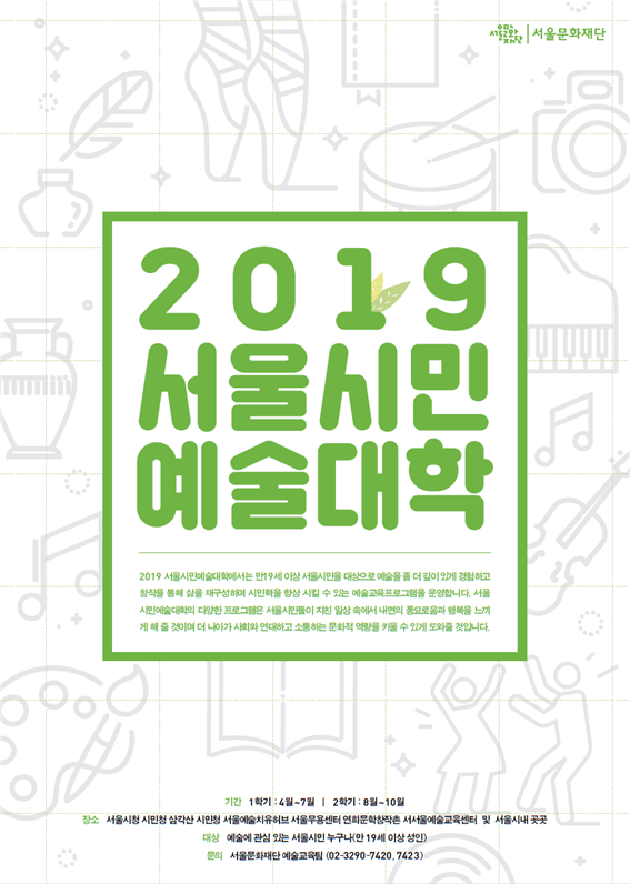 [로컬세계 고은빈 기자]서울문화재단은 오는 10~22일까지 시민이 예술을 좀 더 깊이 있게 경험하고 역량을 높일 수 있는 ‘2019 서울시민예술대학’의 1학기 프로그램 참가자 280여 명을 모집한다고 8일 밝혔다.