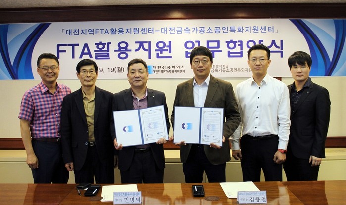 [로컬세계 조윤찬 기자]대전상공회의소 대전지역FTA활용지원센터는 19일 상의회관 4층 소회의실에서 대전금속가공소공인특화지원센터와 FTA 활용지원을 위한 업무협약을 체결했다.