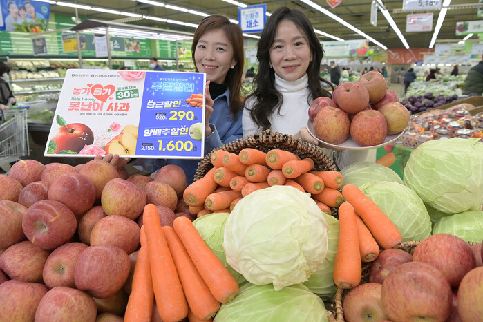▲ 22일(수) 서울시 서초구에 위치한 농협유통(하나로마트 양재점)에서 모델들이 당근, 양배추, 사과를 소개하고 있다. 농협유통 제공 |