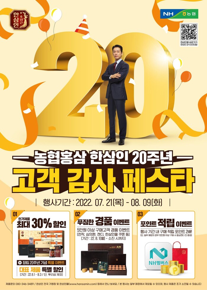 농협(회장 이성희)홍삼은 창립 20주년을 맞아 한삼인의 20년을 함께한 고객에게 감사의 마음을 보답하는 의미로 고객 감사 특별행사를 진행한다고 25일 밝혔다.