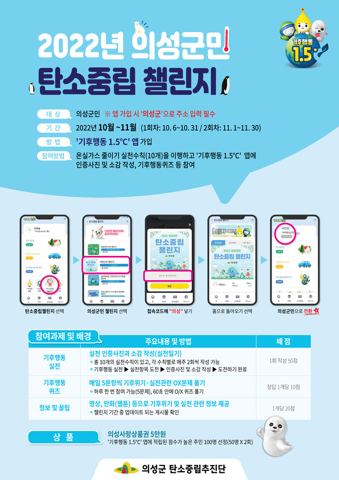 의성군민은 누구나 참여 가능하며 스마트폰에 ‘기후행동 1.5。C’앱을 설치해 회원가입을 하고 ‘의성군민 탄소중립 챌린지’를 선택하면 참여할 수 있다.