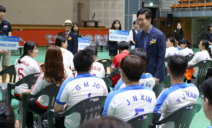 [로컬세계 박명훈 기자]양승조 충남도지사는 25일 오전 아산 시민체육관에서 열린 제11회 전국 시각장애인 골볼 선수권 대회에 참석해 선수단을 격려하고 있다.