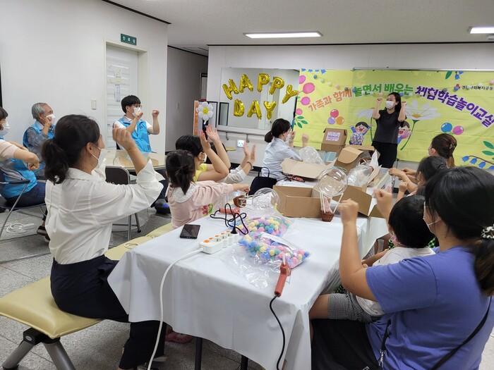 이번 교육은 사곡면 내 만 2세이상 유아를 둔 가족 16여명이 함께 참여해 열기구 무드등 만들기 DIY세트를 활용하여 가족이 함께 작품을 완성하고 지역 내 황희정 선생님의 재능기부로 영어로 배우는 색깔놀이로 정서발달지원과 가족 간 힐링기회를 제공했다.