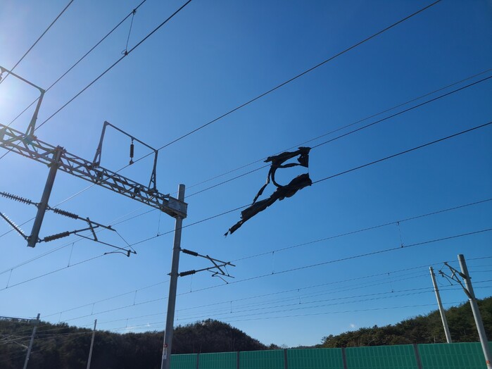 ▲전차선 이물질이 걸려 있다. 코레일 부산경남본부 제공 |