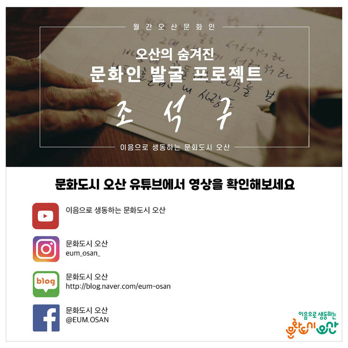 한편 오산의 숨겨진 문화인 발굴과 시민 문화향유 기회 확장을 위해 진행되는 '월간 오산 문화인'은 오산의 숨겨진 문화인을 찾아가는 과정부터, 문화인들의 다양한 활동 모습을 올해 8월부터 12월까지 매 월 한 분 씩 총 5명을 유튜브 영상과 카드뉴스 형식의 매거진으로 소개하고 있다.