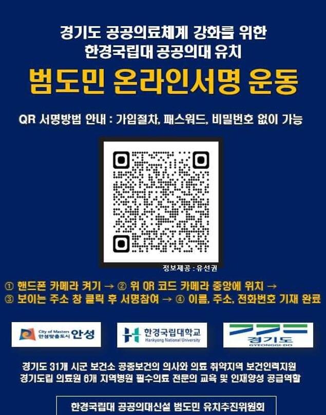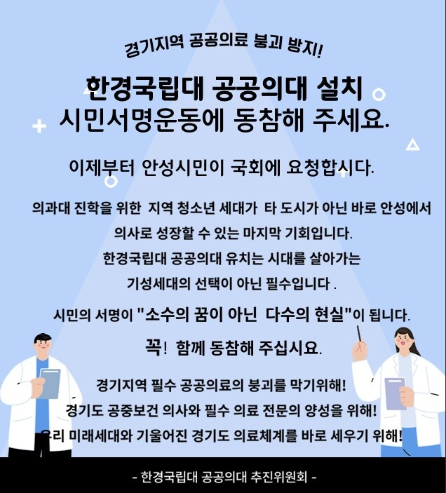 안성시와 추진위원회는 경기도 공공.필수의료체계 붕괴를 막기 위해 한경국립대 공공의대 유치가 필요하고, 공공의대 유치를 위해 “한경국립대 공공의대 설치 시(도)민 서명운동”을 4월부터 진행하고 있다.