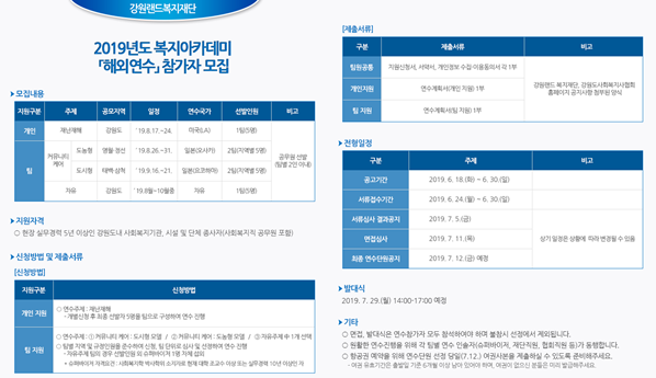 강원도사회복지사협회와 함께하는 ‘2019 복지아카데미 해외연수’는 정부정책과 사회복지 현장 욕구를 반영해 커뮤니티케어(4팀), 재난재해(1팀) 외 자유주제(1팀)로 8월~10월까지 각각 진행된다.