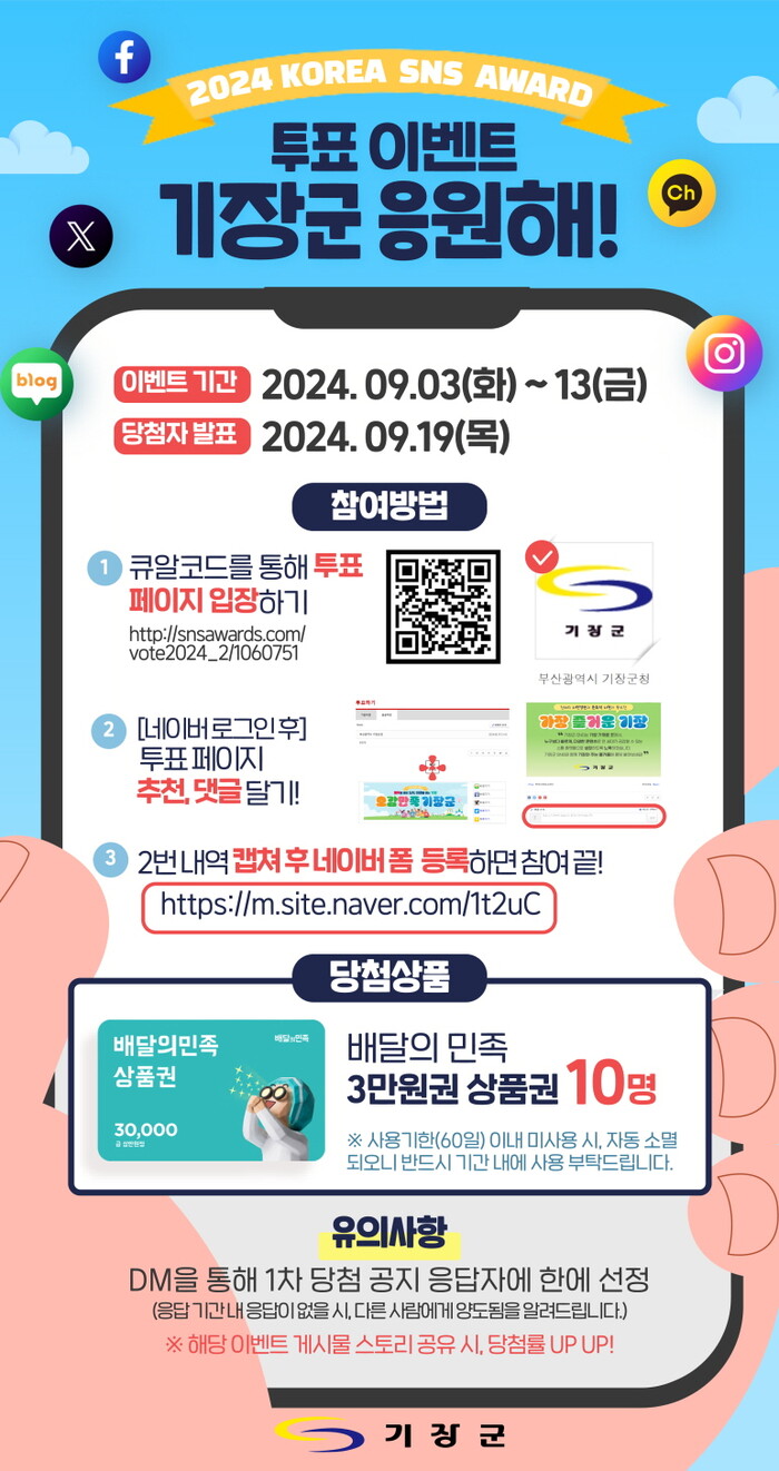 [로컬세계 부산=맹화찬 기자]부산 기장군은 ‘제14회 2024 대한민국 SNS 대상’에 처음으로 참가하면서, 오는 13일까지 전 국민을 대상으로 ‘2024 대한민국 SNS 대상 투표 인증이벤트’를 진행한다고 5일 밝혔다.