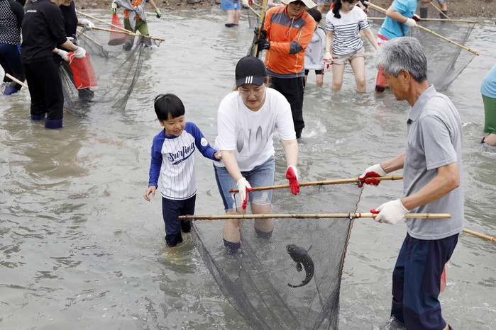 화성 뱃놀이 축제에서 관광객들이 전통 물고기 잡기 체험을 하고 있다.