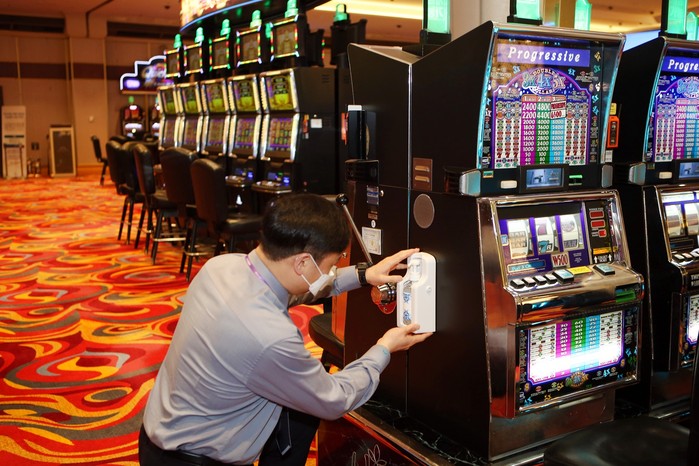 ▲강원랜드 머신팀 직원이 머신기기에 손소독제를 비치하고 있다. |