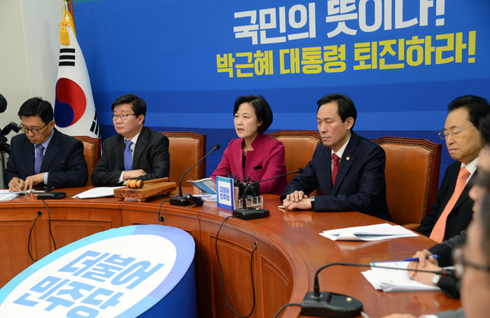 추 대표는 “박 대통령이 인사권 행사, 검찰 조사 거부, 엘시티(LCT) 수사 지시를 하면서 친박 지도부를 버티게 하고 그 하수인을 시켜 촛불민심을 인민재판·마녀사냥이라 공격하고 있다”고 지적했다.