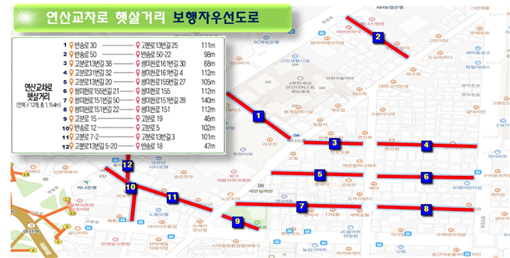 부산시가 지난 13일 ‘보행안전 및 편의증진에 관한 법률’에 따라 13개소 49개 구간(9,966m)을 보행자우선도로로 지정함에 따른 것이다.