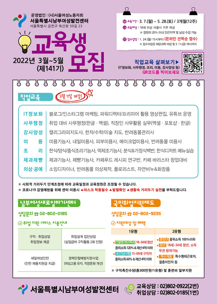 접수는 구로여성인력개발센터(공원로 63) 방문 또는 전화로 진행된다.