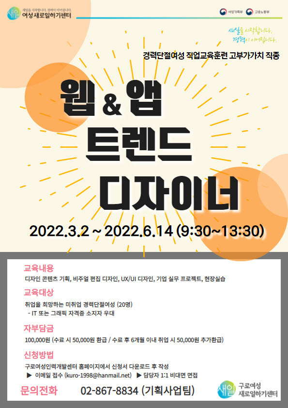 구로구는 디자인 교육을 제공하는 ‘웹‧앱 트렌드 디자이너’ 프로그램을 마련한다. 수업은 디자인 콘텐츠 기획부터 편집 디자인, UX‧UI 디자인, 기업체 요구 분석 및 실무 프로젝트 등 실습 중심으로 마련된다. 구로여성인력개발센터에서 진행되는 강의는 3월 2일부터 6월 14일까지 진행되며 강의 인원은 최대 20명이다.