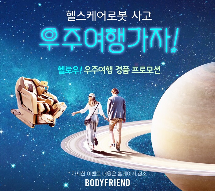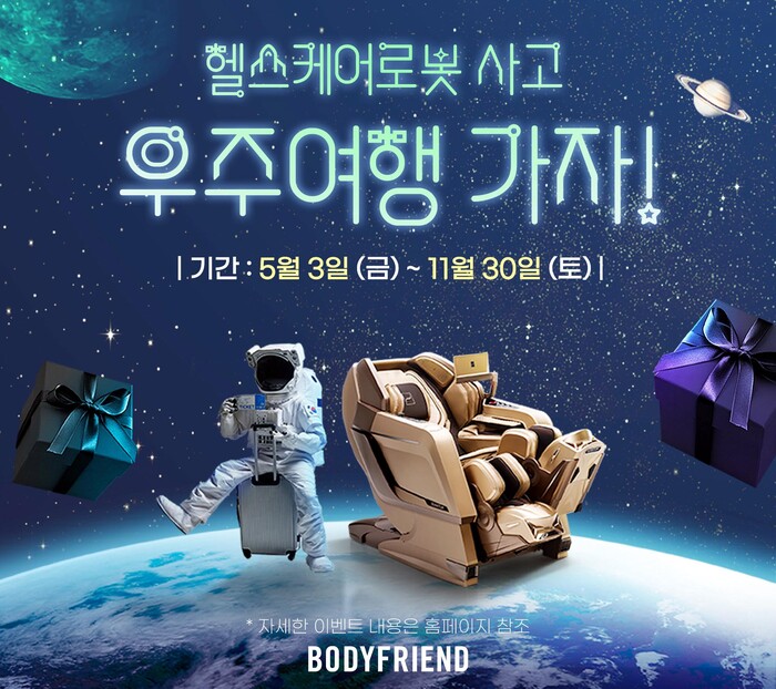 바디프랜드 관계자는 “마치 우주에 있는 듯한 편안함을 선사하는 바디프랜드 헬스케어로봇의 제품력에서 착안해 이번 프로모션을 기획했다"며 "헬스케어로봇과 우주여행으로 건강과 나만의 로망을 실현하고 우주에서 환상적인 지구의 풍경을 바라보는 생에 다시없을 기회를 꼭 잡으시길 바란다”고 전했다.