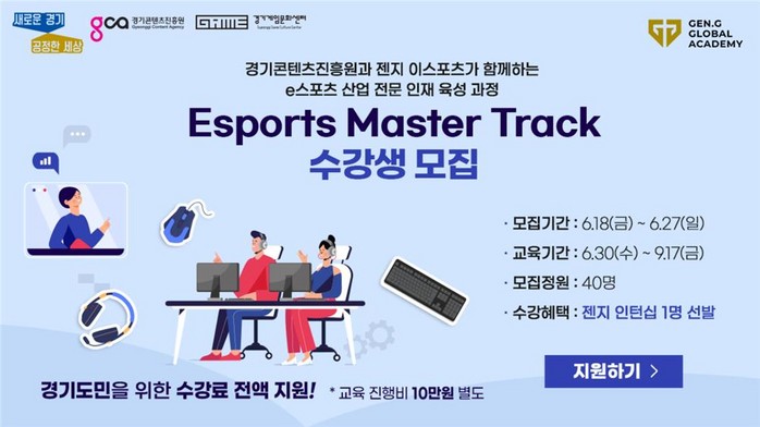신청 자격은 이스포츠 업계 진출을 꿈꾸는 경기도민이나 경기도 내 기관 소속이라면 누구든 신청할 수 있다. 수강료는 학기당 10만원이며 1학기, 2학기 각각 40명의 수강생을 모집할 계획이다.