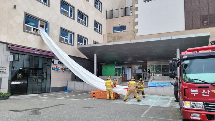특히 거동불편 환자들이 많은 시설인 만큼 관계자 및 초기 대응 인원의 대피용 자루(수직구조대)를 활용한 인명대피 훈련에 중점을 두었다.