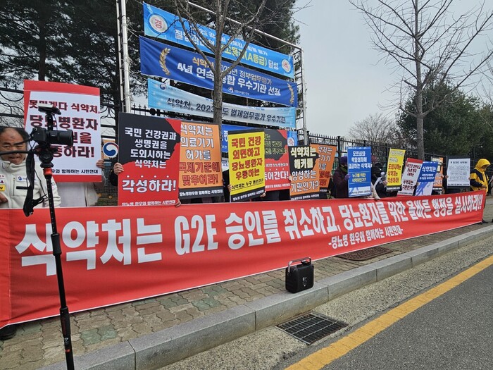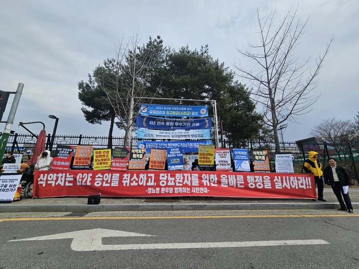 ▲3월 19일 오전 식품의약품안전처(이하 식약처) 정문 앞에서 당뇨병 환우와 함께 하는 시민연대 회원들이 국민건강권 외면에 대한 각성을 촉구하고 시위를 하고 있다. |