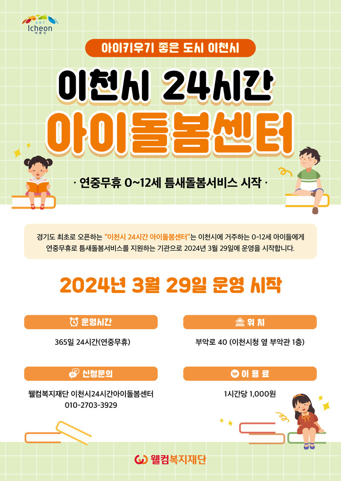 이천시 24시간 아이돌봄센터 운영 지원사업은 영유아부터 초등학생(0세~12세) 아이를 둔 이천시 주소를 둔 부모(보호자)라면 누구든지 이용 가능하며, 사랑으로 보듬어 밤에도 안전하게 돌봐 주는 경험 많고 따듯한 전문 보육교사가 상시 대기중이며, 이용료는 시간당 1천원으로 직접 방문 및 전화예약 신청 가능하다.