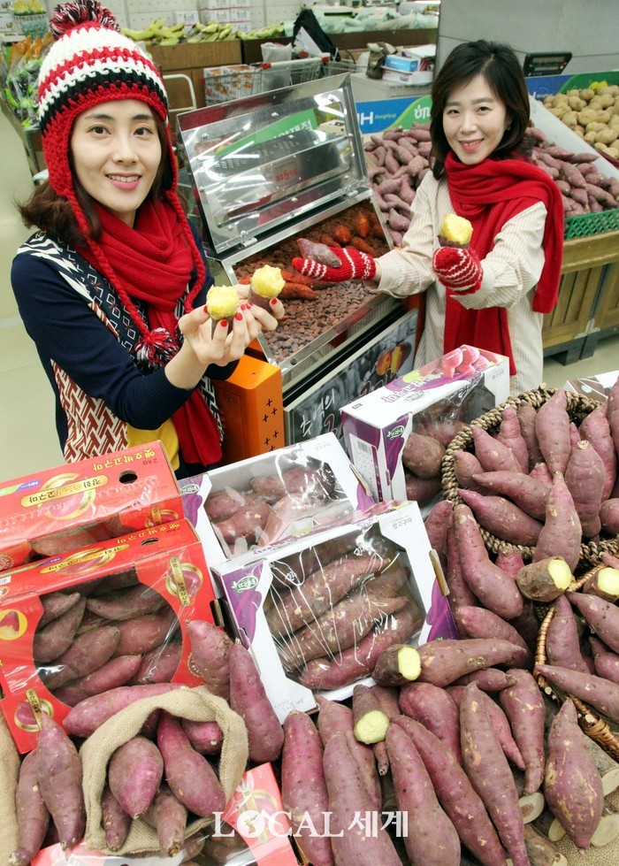서울 서초구 농협유통 하나로마트 양재점에서 직원들이 고구마를 선보이고 있다. 농협유통 하나로마트 양재점에서는 찬바람이 불면 생각나는 고소하고 달콤한 고창, 여주, 강화, 영암 고구마를 할인 판매하며, 영암 고구마는 주말(11일~13일) 100g에 260원으로 초특가 판매한다.