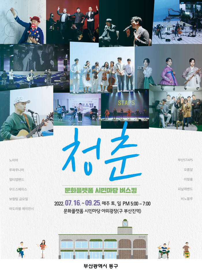 [로컬세계 부산=맹화찬 기자]부산 동구청은 오는 16일부터 9월말까지 매주 토·일요일 17시에서 19시까지 문화플랫폼 시민마당(옛 부산진역사) 야외광장에서 국악, 마술, 대중음악, 재즈 등 다양한 공연을 펼친다고 13일 밝혔다.