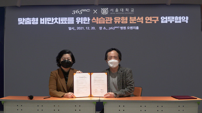 ▲365mc네트웍스 김남철 대표이사(오른쪽)와 서울대 식품영양학과 이정은 교수 연구팀이 '맞춤형 비만치료를 위한 식습관 유형 분석 연구' 업무협약을 지난 20일 서울 365mc병원 오렌지홀에서 체결했다. [365mc 제공] |