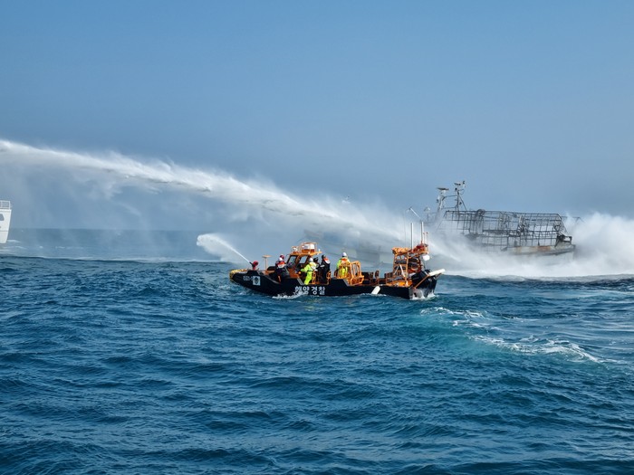 ▲거제 지심도 인근 해상 선박 화재 진압 [부산해양경찰서 제공] |
