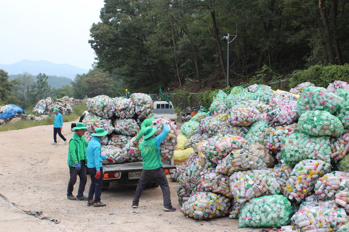 | ▲의성군 새마을회는 지난 19일 환경공단 의성수거사업소에서 ‘농약 빈병모으기 경진대회’를 열어 총 57톤에 달하는 빈병을 수거했다.(의성군 제공) |