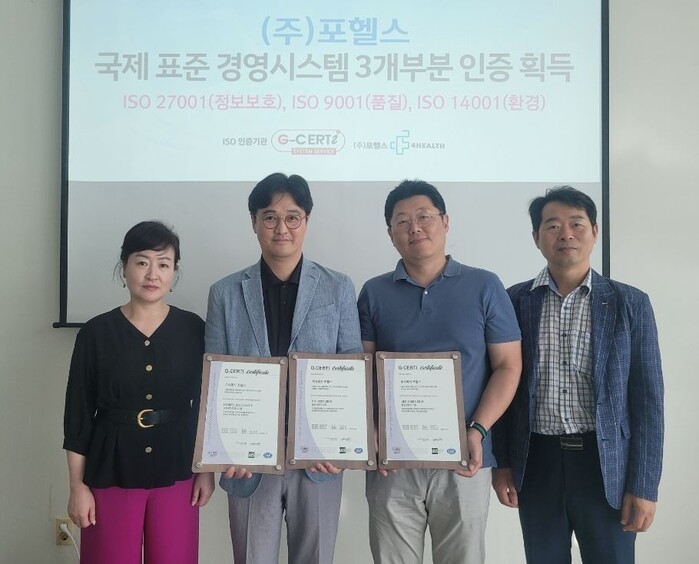 ㈜포헬스가 세계적으로 인정받는 국제표준인 정보보안경영인증 ‘ISO27001(ISO/IEC27001)’, 품질경영인증 ‘ISO9001(ISO/IEC9001)’, 환경경영인증 ‘ISO14001(ISO/IEC14001)’을 동시에 획득했다.