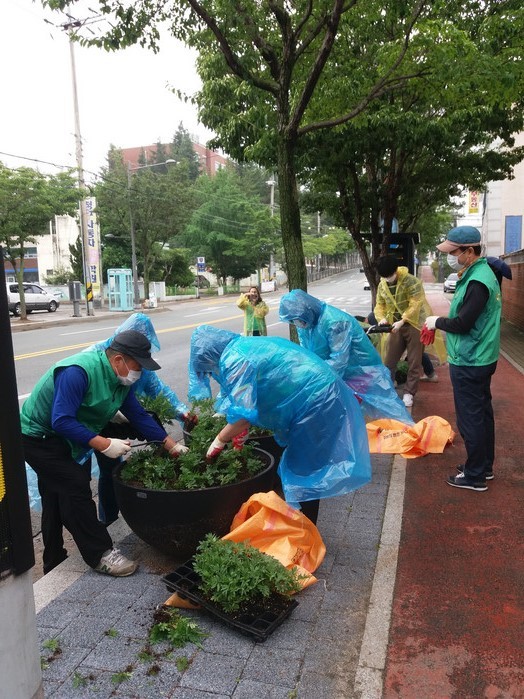 두 단체는 15일은 쾌적하고 아름다운 마을을 만들기 위해 관내 도로변 화분 등에 보슬비를 맞으며 여름꽃을 심었다.