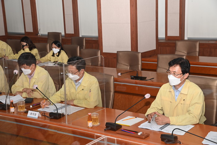 ▲이환주 시장(오른쪽)이 19일 시청 회의실에서 ‘2022년 신규시책 발굴 보고회’를 주재하고 있다. 남원시 제공 |
