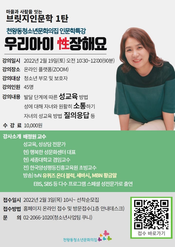 [로컬세계 임종환 기자]서울 구로 천왕동 청소년문화의집이 자녀의 성교육으로 고민하는 가정을 위해 ‘우리아이 性장해요’ 특강을 펼친다.