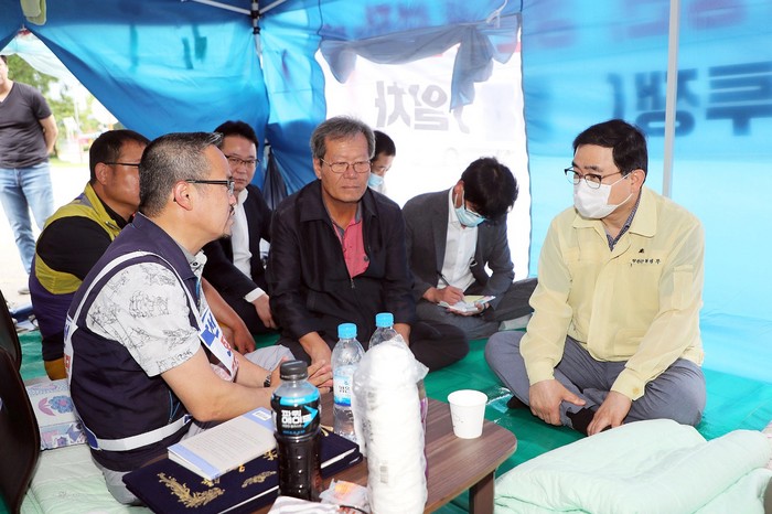 허 시장은 “가족과 시민들 모두 두분의 건강을 많이 걱정하고 있다. 지역사회 고용안정을 책임지는 시장으로서 마음이 아프다. 무엇보다 건강이 중요하다”고 말하며며, 이장섭 지회장과 함께 단식 농성 중인 류조환 민주노총 경남본부장의 건강을 먼저 챙겼다.