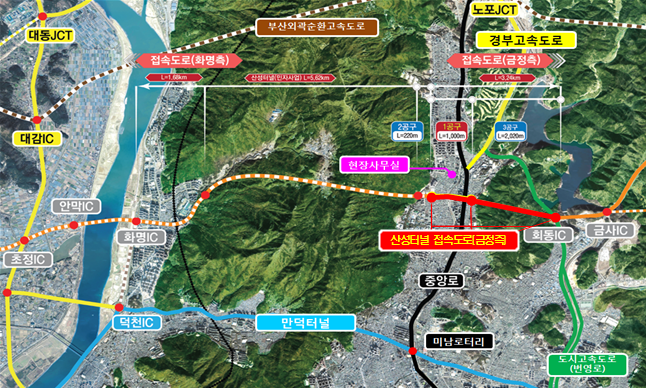 산성터널 금정측 접속도로는 부산시 금정구 장전초등학교~회동나들목(IC) 구간에 걸쳐 폭 20~50m의 도로로 지하차도와 터널, 교량 등 총연장이 3.24㎞에 달한다.