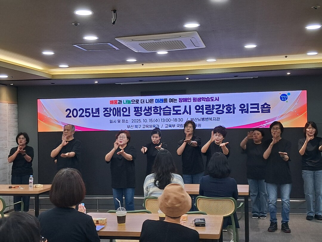 [로컬세계 = 맹화찬 기자]부산 북구 구포1동은 ‘손으로 하나되는 우리’ 수어 교실 참여자들이 지난 15일 열린 2025년 장애인 평생학습도시 관계자 역량강화 워크숍 식전 무대에 초청돼 수어 공연을 선보였다고 23일 밝혔다.