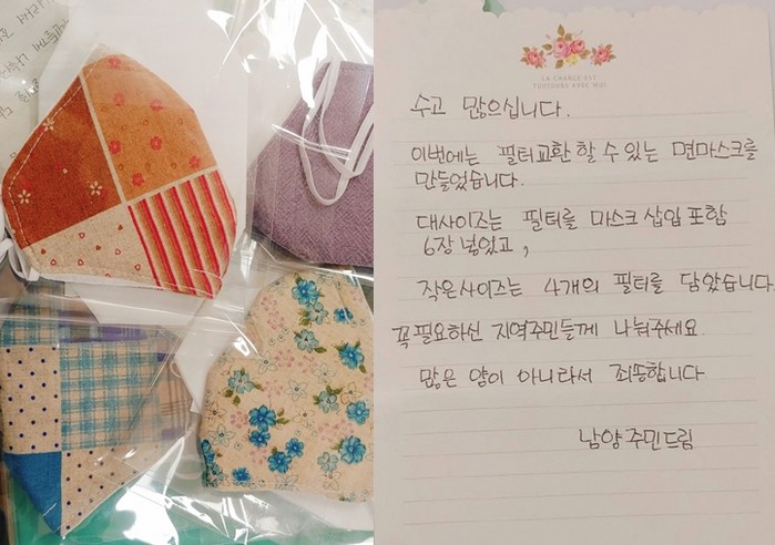 지난 1일 남양읍에서는 이름을 밝히지 않는 주민이 행정복지센터에 ‘많은 양이 아니라서 죄송하다’라는 편지와 함께 직접 만든 마스크 48개를 후원했다.