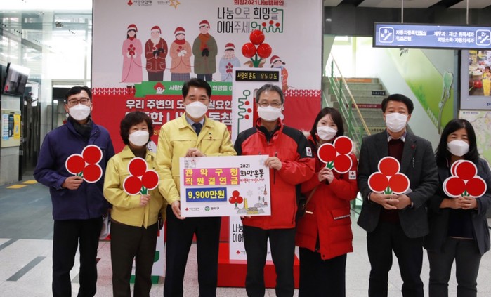 [로컬세계 임종환 기자]서울 관악구가 ‘2021 희망온돌 따뜻한 겨울나기’ 성금으로 직원들이 지난 1년간 모은 기부금 9900만원을 서울 사회복지공동모금회에 전달했다고 11일 밝혔다.