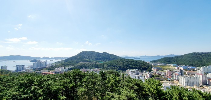 | ▲진해탑 전망대에서 본 태평동 전경. 정면의 산은 고절산이다. |