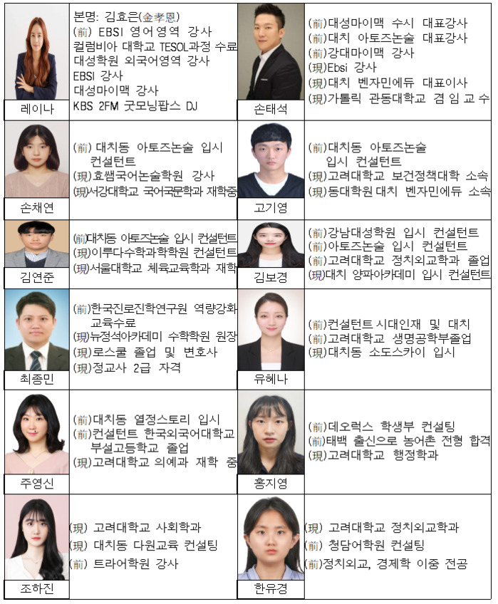 1부 특강은 입시전문가인 레이나(본명 김효은) 강사와 대치 벤자민 에듀 대표이사인 손태석 강사가 최신 입시정보 및 대입제도 대응 방안 등 강연이 포함된 입시 설명을 제공하며, 2부에서는 사전 신청을 마친 수험생 80명을 대상으로 11명의 입시 전문 상담사를 통해 1:1 맞춤형 진학 컨설팅이 이루어진다.