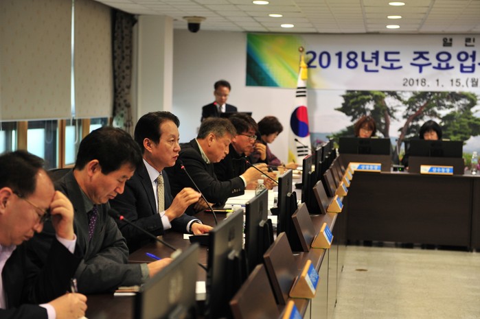 ▲15일 오전, 김연식 시장이시청 소회의실에서 ‘2018 주요업무시행계획 보고회’를 주재하고 있다.(태백시 제공) |
